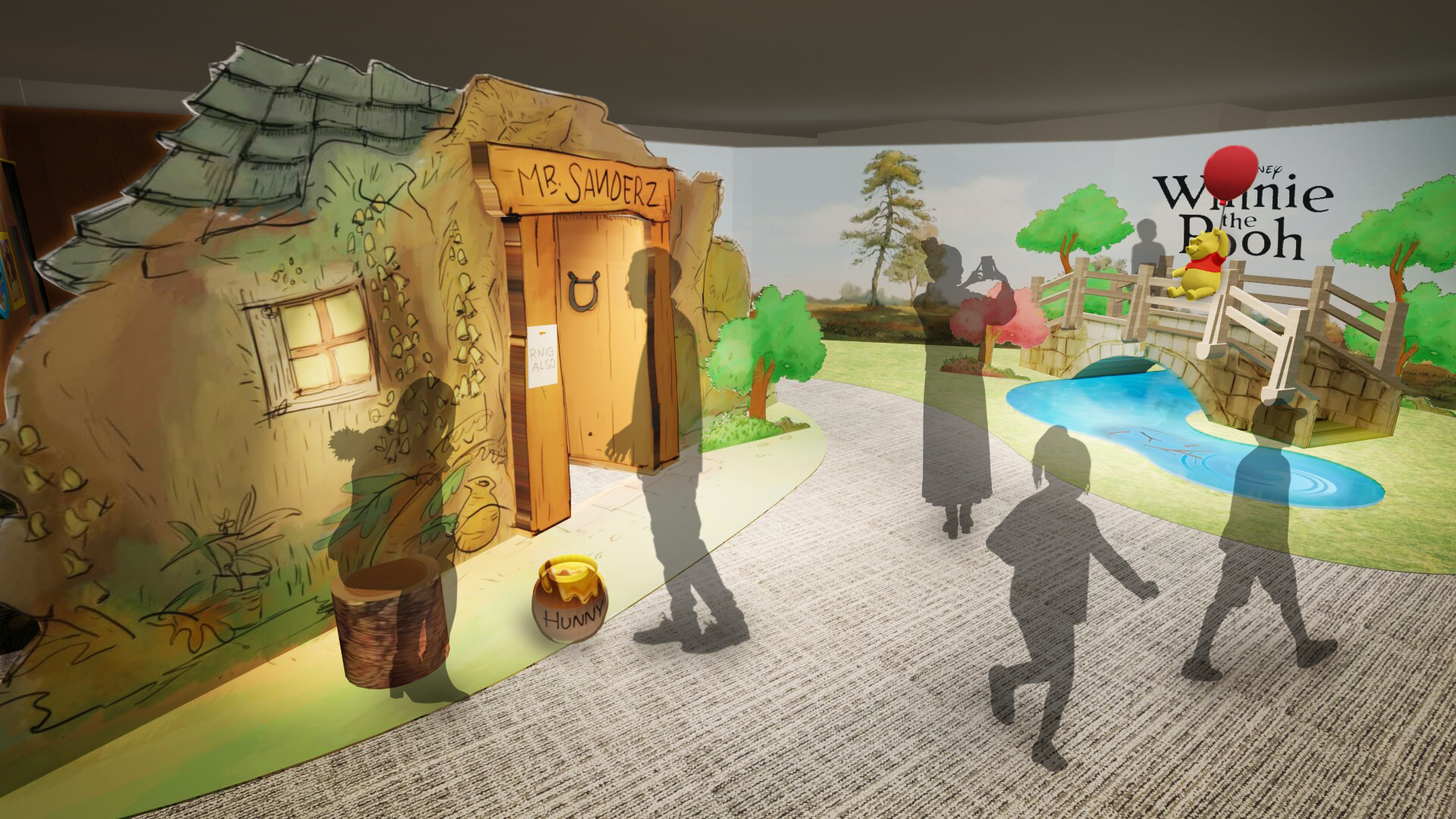 100エーカーの森へ足を踏み入れれば、ディズニー・アニメーション『くまのプーさん』のコンセプトアートや背景資料などが並びます。優しい木漏れ日を浴びながら、プーと仲間たちの世界に浸ることができます。